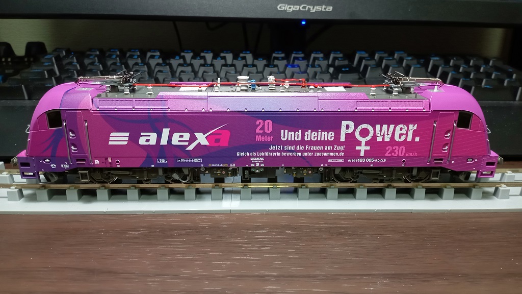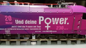 このモデルは、2020年の国際女性デーを記念して”Jetzt sind die Frauen am Zug”のスローガンとともにラッピングされた機関車です。要は鉄道業界のキャリアへの女性の進出を促すといった所でしょうか。