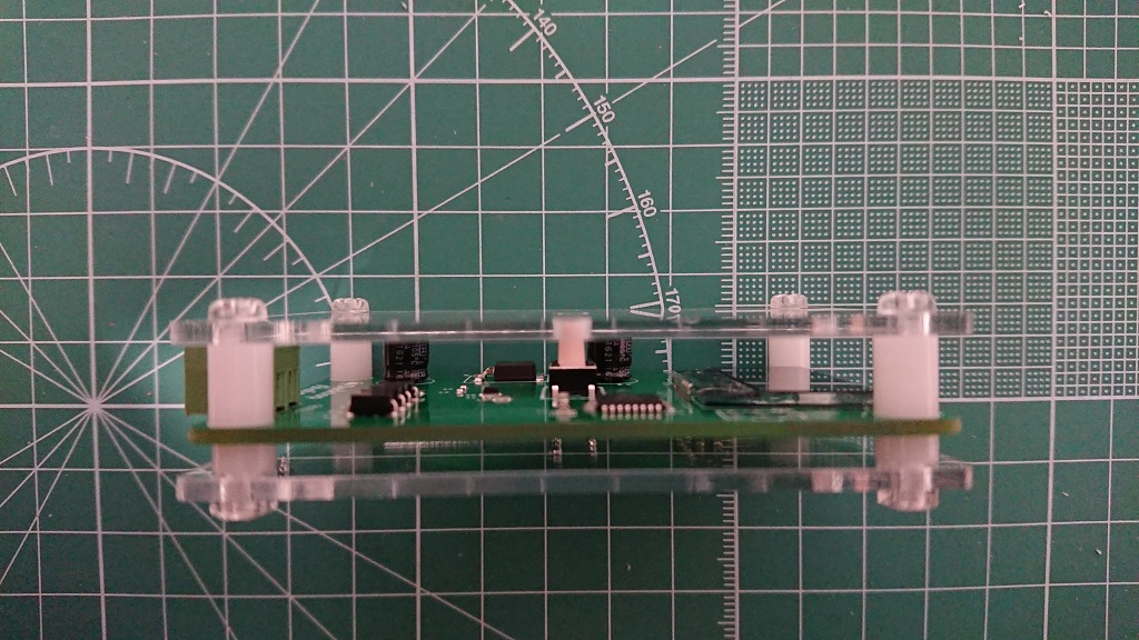 側面から見た所。穴の位置は問題ありませんが、タクトスイッチの足が短くてパネルより引っ込んだ状態なので、このままでは押せません…