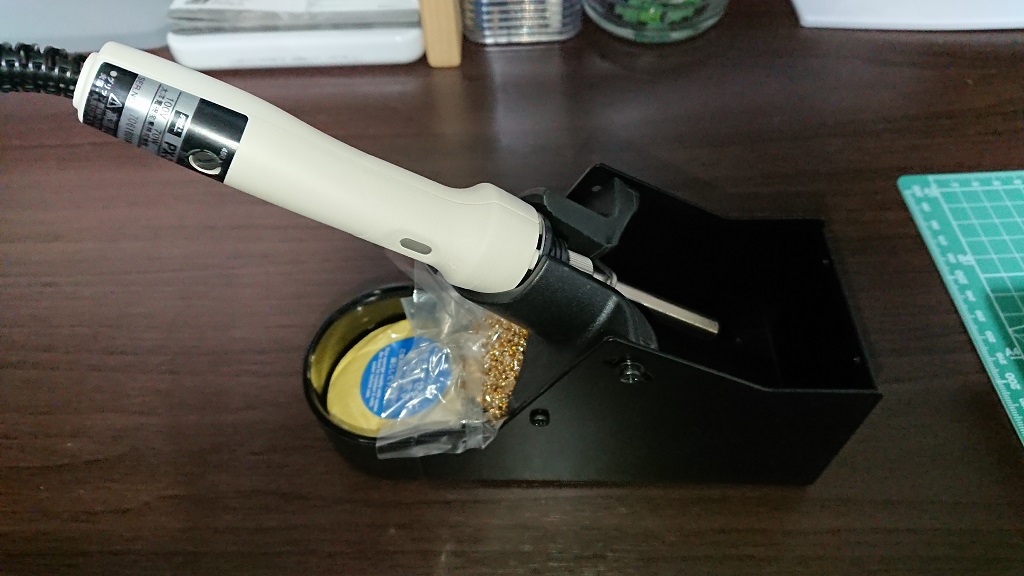 ハンダ付けをする際、コテを机の上に置いたり、コテ先を濡れ雑巾で拭いたりするのは、安全面からも効率面からも色々問題があるので、ヨドバシでコテ台などを買って(正確にはヨドバシドットコムで取り寄せの為に配達日時指定不可だったので、店頭受け取り)きました。