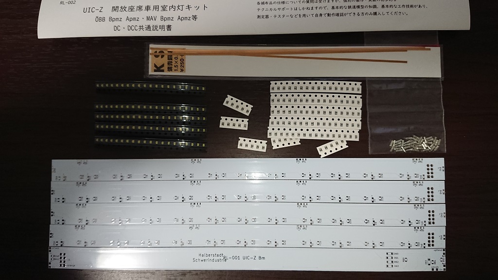 それぞれ、上は「RL-001 2等コンパートメント車用室内灯キット」、下は「RL-002 開放座席車用室内灯キット」の中身です。基板が5枚と表面実装LED(白色か電球色いずれか)と2012サイズの抵抗(LEDの電流制限用各種)とICソケットが含まれています(DCC版のみ、DC版は代わりにダイオードブリッヂ用のショットキーバリアダイオードが含まれています)。