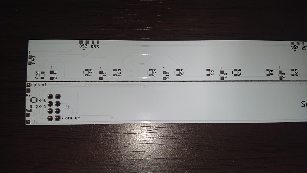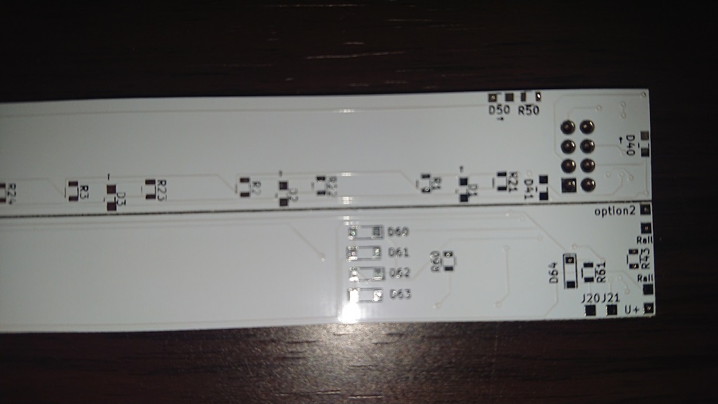 写真の基板は2等コンパートメント車用の基板ですが、コンパートメントの部分と通路の部分とデッキ部とにLEDが配置され、NEM652のソケットにファンクションデコーダを挿入する事によって、デッキ・通路部とコンパートメントの部分とで別々に点灯を制御出来、またコンパートメントの部分は回路が2回路に分かれているので、点灯しているコンパートメントと消灯しているコンパートメントを分けたりする事も、2012サイズの抵抗の付け方次第で選択出来るようになっています。また、レール集電のコネクタが基板の両端に有るので、これを利用すれば通電カプラーの車両内の引き通しが不要になります。こういう室内灯が欲しかった!その上、基板が薄いので、恐らく殆どのメーカーのUIC客車の屋根に取り付けられると思います。また、私はDCC版を選択しましたが、この室内灯は一部取り付けるパーツを変える事によりDCでも動作する様になっています。