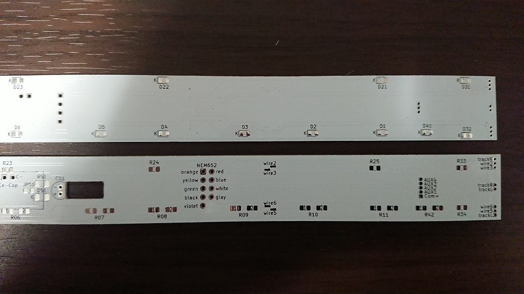 電気回路の知識もほぼ無い中、DesktopStationさんとかの基板を見よう見まねで、初めて設計した基板です。むろんElecrowへの発注も初めて。NEM652のデコーダを取り付けられたり、Nuckyさんのワンコインデコーダを取り付けられたり、BRAWAの6ピン通電カプラーに対応していたり、ハルバー重工さんの基板と同じく抵抗を取り付ける場所によってLEDが点灯するファンクション(回路)が切り替えられたり、あれこれ詰め込み過ぎた試作品です。シルク印刷に誤植があったり、ダイオードブリッヂの回路が間違っていたり、色々と残念ですが。試作品として、これを作って得た物は次回作にフィードバックします。